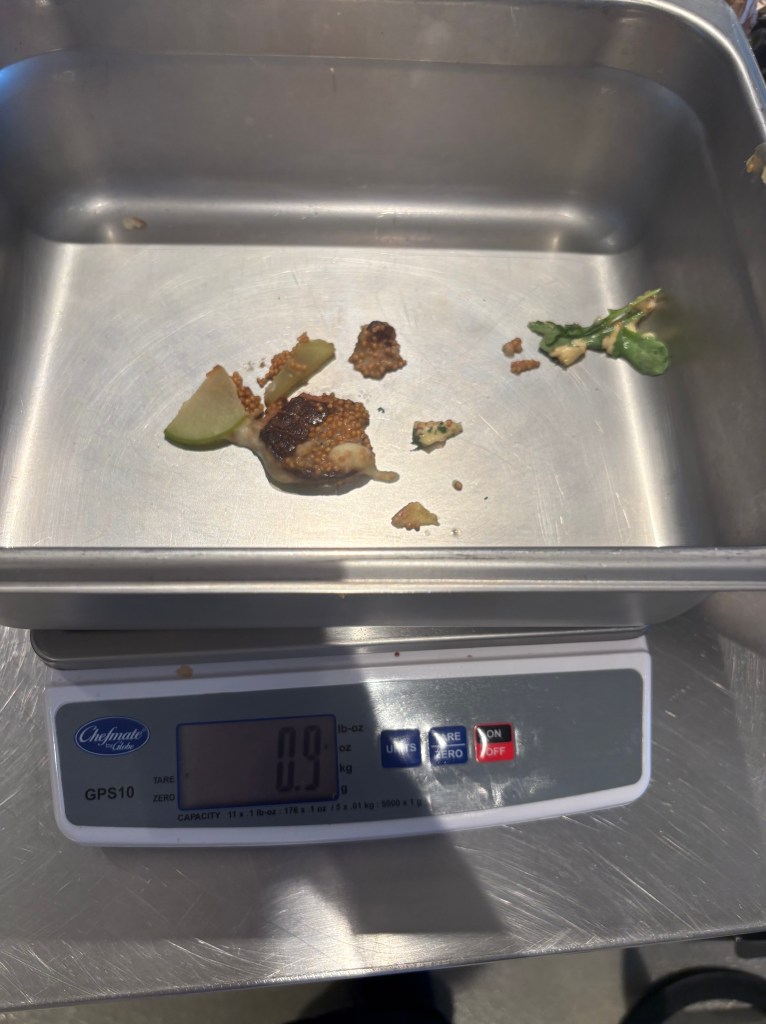 Our usable waste, weighing in at 15.3oz was due mostly to our mise and the typical scraps that come with a mise. LeanPath, a food waste-prevention company approximates this waste costing $0.07/oz, meaning $1.07 was wasted on this waste.