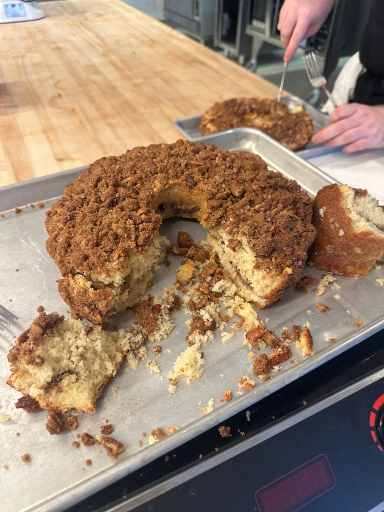This week’s lab laid out a great foundation for the different techniques we will use often in this lab. Our primary method of creaming worked well for our sour cream coffee cake, however due to the somewhat cold temperature of the butter, the creaming took longer than anticipated at a higher speed. The blueberry muffins were almost perfect, except for just a few muffins over-doming slightly on top. The biscuits took on too much flour, so we had to adjust and remove flour when rolling out the dough. We also switched out the milk for buttermilk to add some tang, which tasted really nice in the overall product.