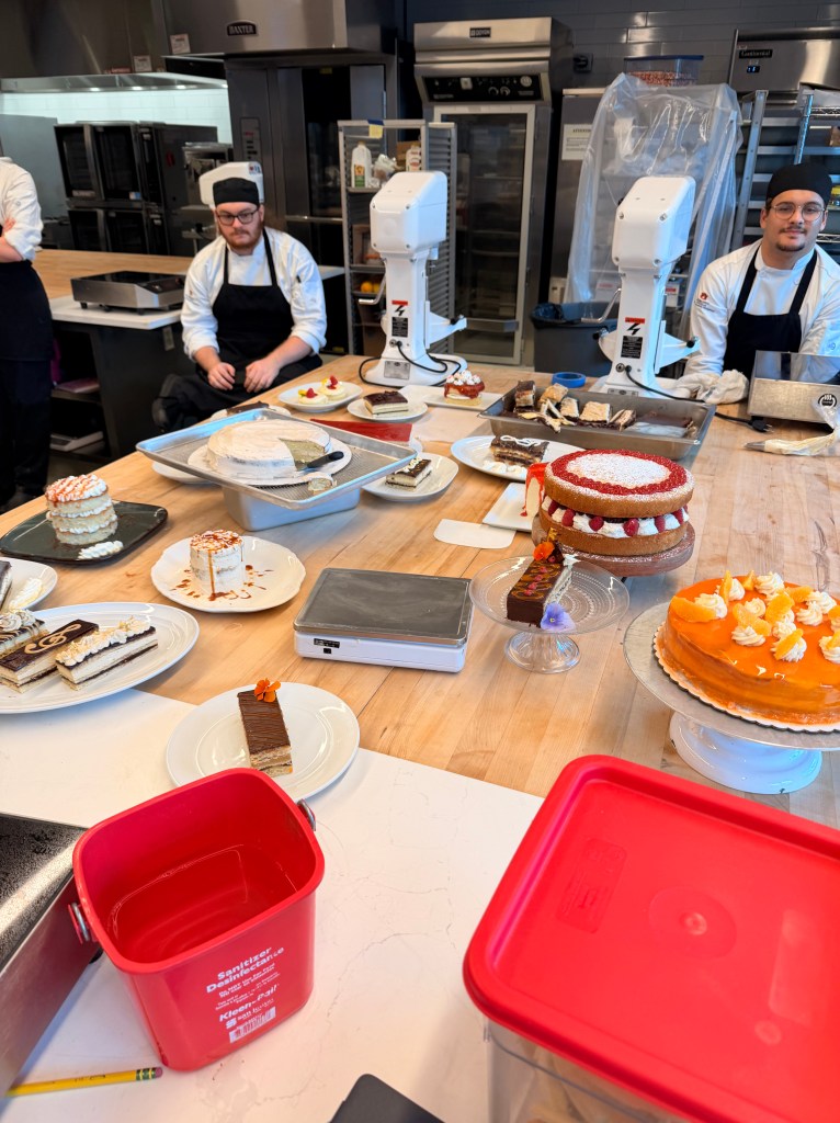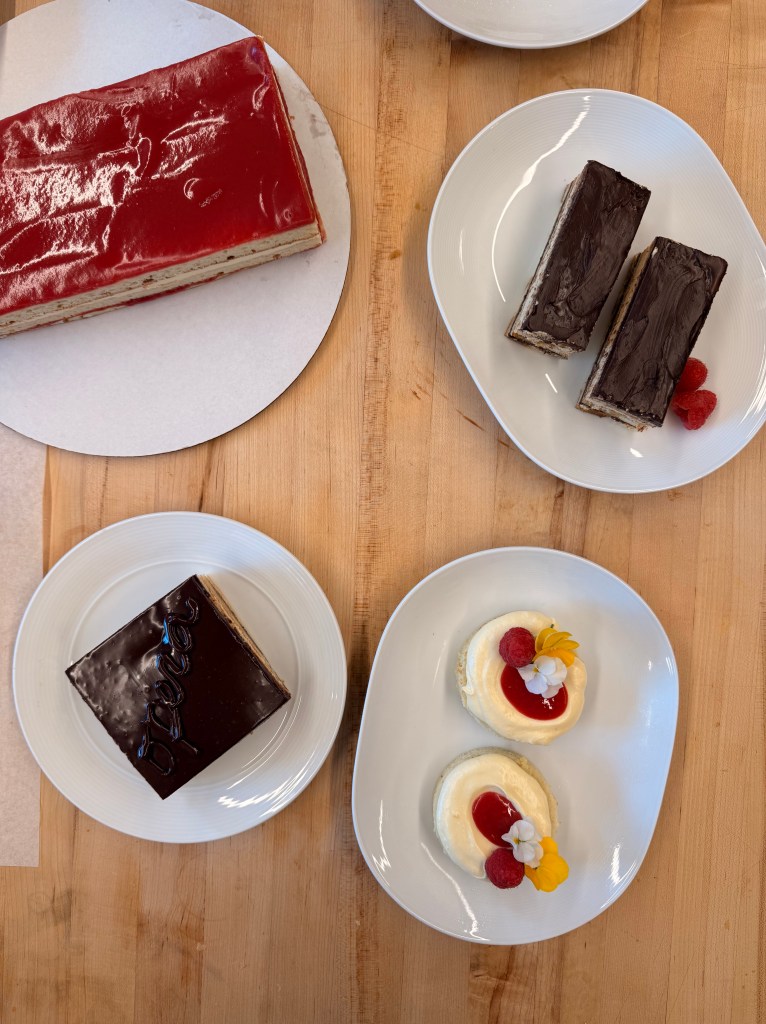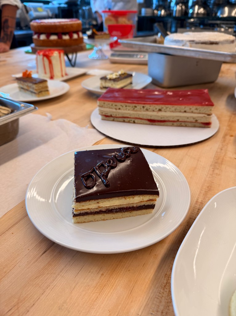 During the torts and entremets unit, we produced two classic items: a Victoria sponge and an opera cake. The Victoria sponge baked evenly but resulted in a noticeably dense crumb rather than the light, aerated structure typical of the style. Our opera cake showcased clear flavor components—almond joconde, coffee buttercream, and chocolate ganache—but the final product featured fewer layers than ideal, causing the cake to appear taller and less refined than traditional entremets standards.