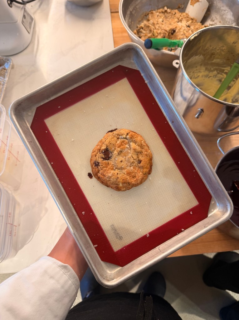 For the cookie, we prepared Chef Dallas’ chocolate chip cookie recipe, while replacing the butter with browned butter, adding our salted caramel, and adding in chopped dark chocolate, white chocolate, toasted hazelnuts, and marshmallows. We baked off one tester cookie, and judging how it turned out, I think we have a really good cookie on our hands.